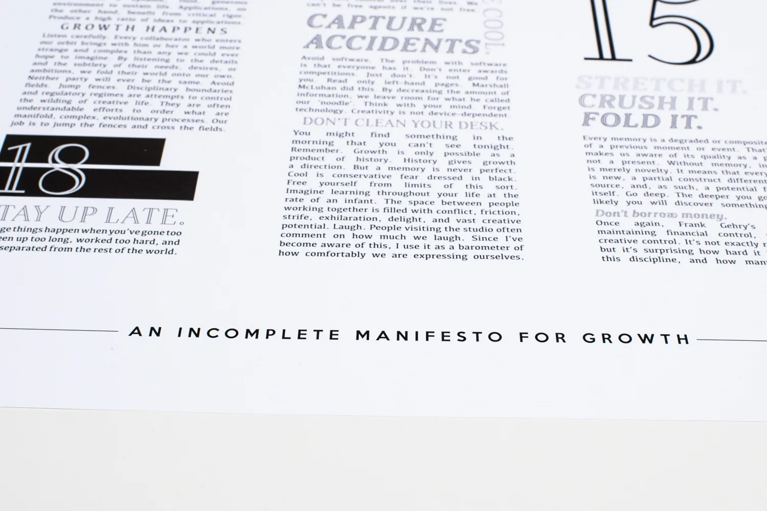 I designed this poster from the text of An Incomplete Manifesto For Growth. The goal was to fit every world onto the 11 x 17 sheet with any design desired. I used the inspiration from old newspapers to begin my design. I wanted to make sure every word was legible but also call out the parts I wanted the viewer to focus on. These callouts are the titles of different numbers to the rules in the manifesto. They are not only titles however, they are motivation to keep going, capture accidents, and take breaks in order to be a better designer.